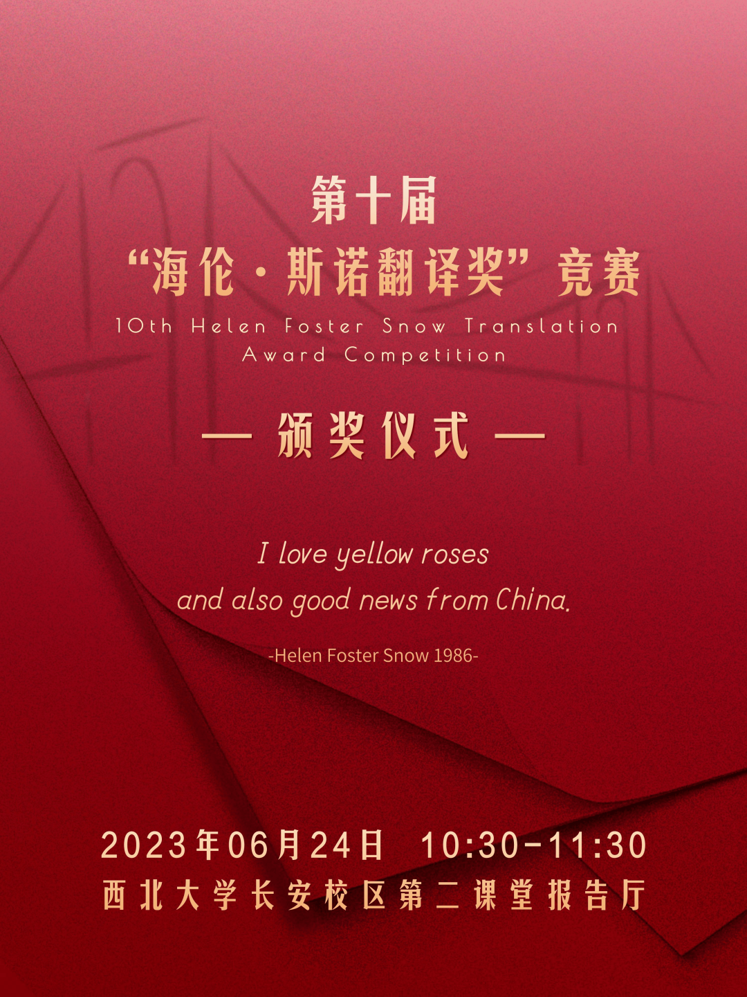 第十届“海伦·斯诺翻译奖”竞赛颁奖仪式定于2023年6月24日10:30-11:30在西北大学长安校区第二课堂报告厅举办,组委会诚挚邀请您届时拨冗莅临!