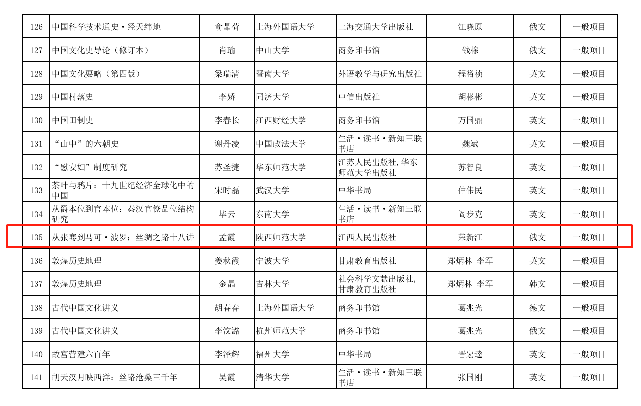 6月27日,全国哲学社会科学工作办公室公布了2023-2024年度国家社科基金中华学术外译项目立项名单。陕西省翻译协会俄语委员会主任、陕西师范大学外国语学院俄语系主任孟霞教授主持申报的《从张骞到马可·波罗:丝绸之路十八讲》项目获批立项。