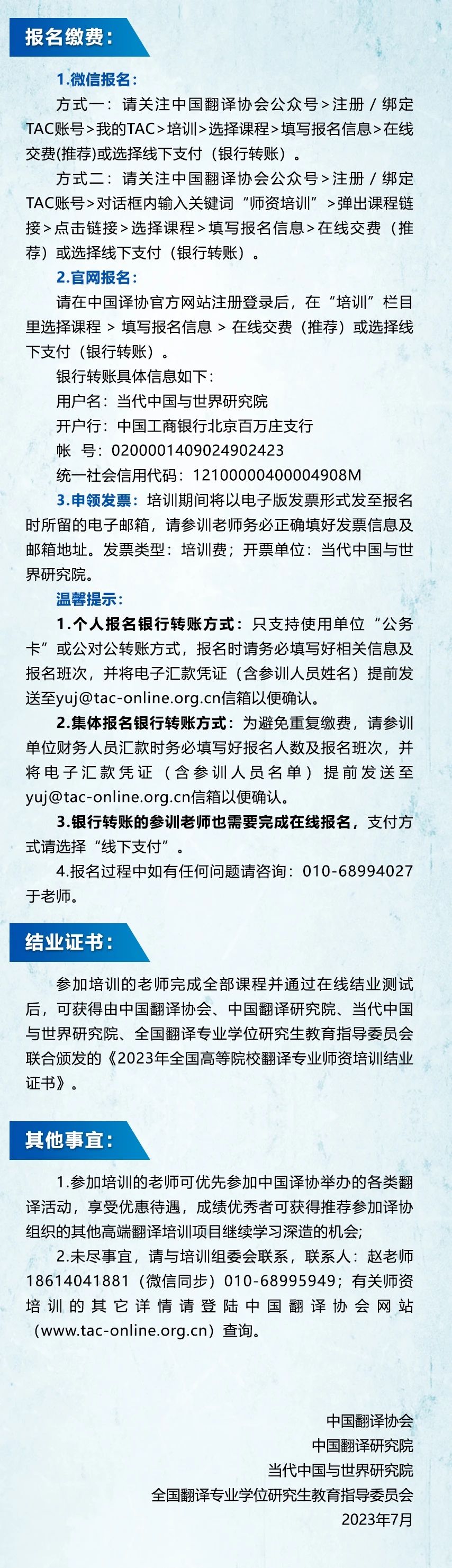 由中国翻译协会、中国翻译研究院、当代中国与世界研究院、全国翻译专业学位研究生教育指导委员会联合主办,《中国翻译》杂志社承办的2023年全国高等院校翻译专业师资培训定于7月15日至9月10日以线上方式举办。
