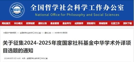 为进一步做好国家社科基金中华学术外译项目工作,现向国内各出版单位、重点院校和科研机构、全国性社科学术社团以及广大专家学者征集2024-2025年度中华学术外译项目选题。有关事项通知如下: