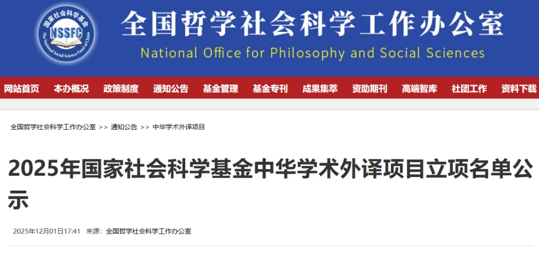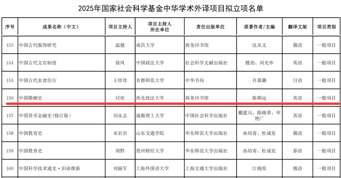 12月1日,全国哲学社会科学工作办公室公示了2025年国家社会科学基金中华学术外译项目立项名单,我会理事、法律翻译专业委员会副主任、首届中国翻译协会优秀中青年工作者、西北政法大学外国语学院付欣副教授主持的《中国婚姻史》英译成果进入公示名单,实现了该校、该院在该项目的历史性突破,彰显了该校在哲学社会科学外译与国际传播领域的重要进展。